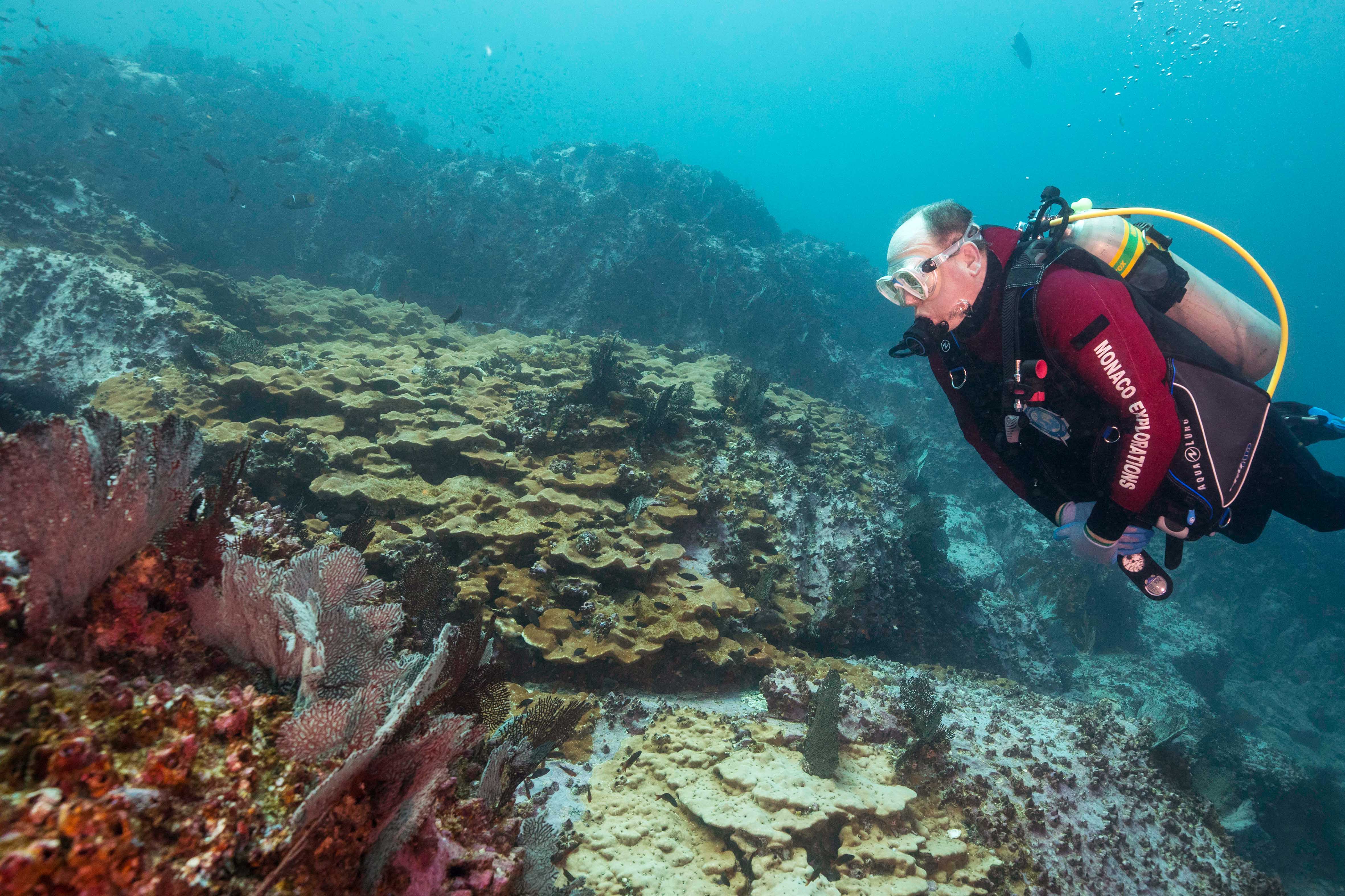 Fürst Albert II. von Monaco schaut sich beim Tauchen den Zustand der Unterwasserwelt an. Bild: "obs/ZDF/Olivier Borde"