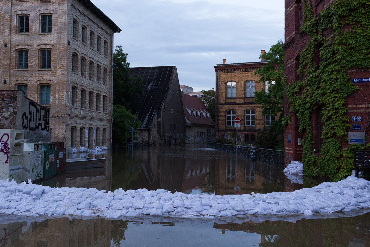 Umspülte Sandsäcke im Stadtzentrum von Halle (Saale)