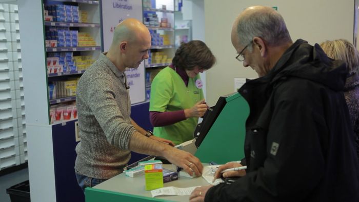 Klaus Balzer (rechts) in der Apotheke. Für ZDFzoom vergleicht er die Medikamentenpreise in Deutschland mit denen in Frankreich. Bild: ZDF und Felix Korfmann