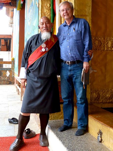 Fürst Kado, der Verbindungsmann des ZDF-Teams und Wolfgang Herles beim Verlassen des Klosters im Dzong von Thimphu. Bild: ZDF und Thomas Rebholz