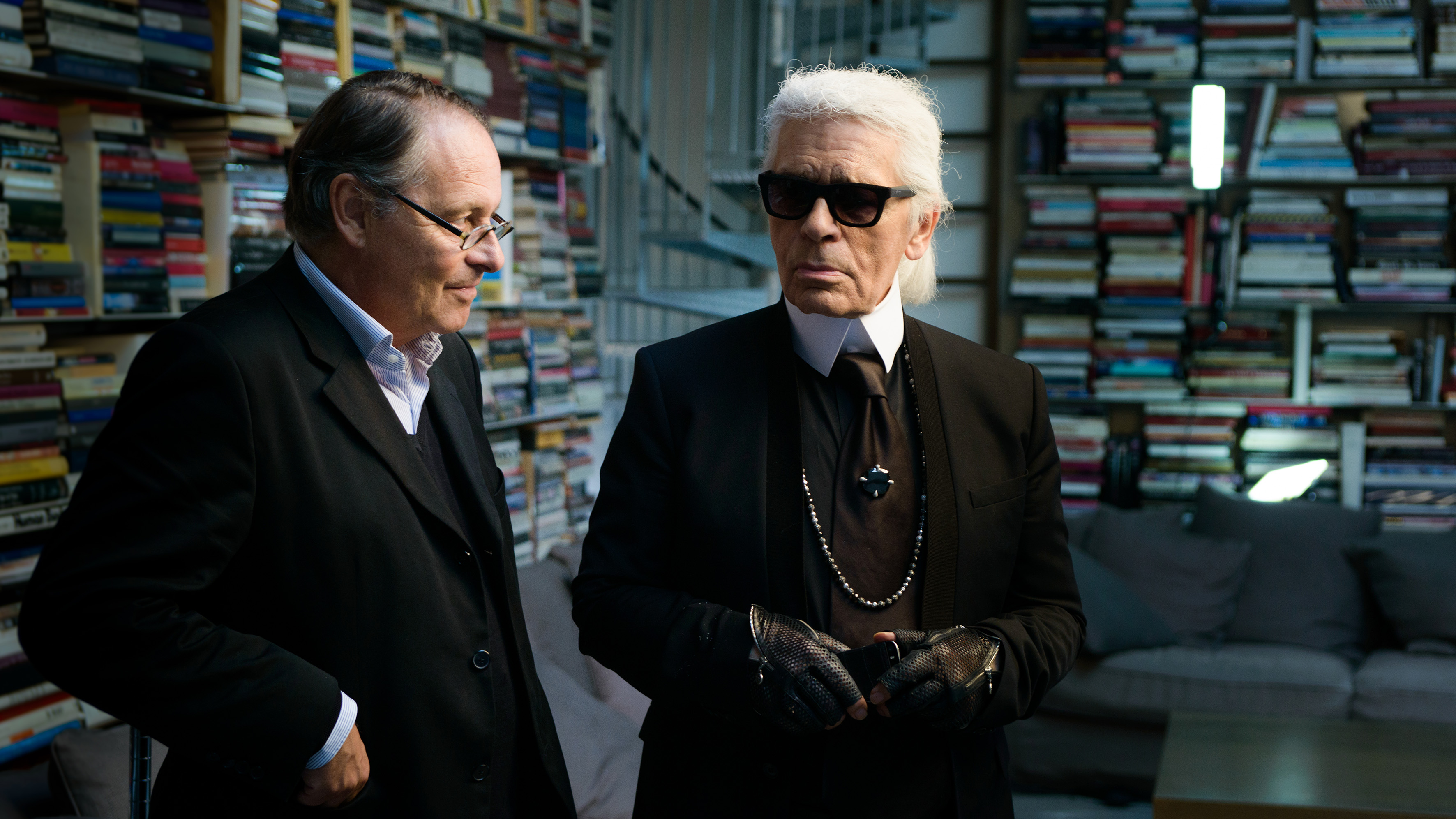 Designer Karl Lagerfeld (r.) im Gespräch mit Filmemacher Gero von Boehm (l.). Bild: ZDF Fotograf: Till Vielrose