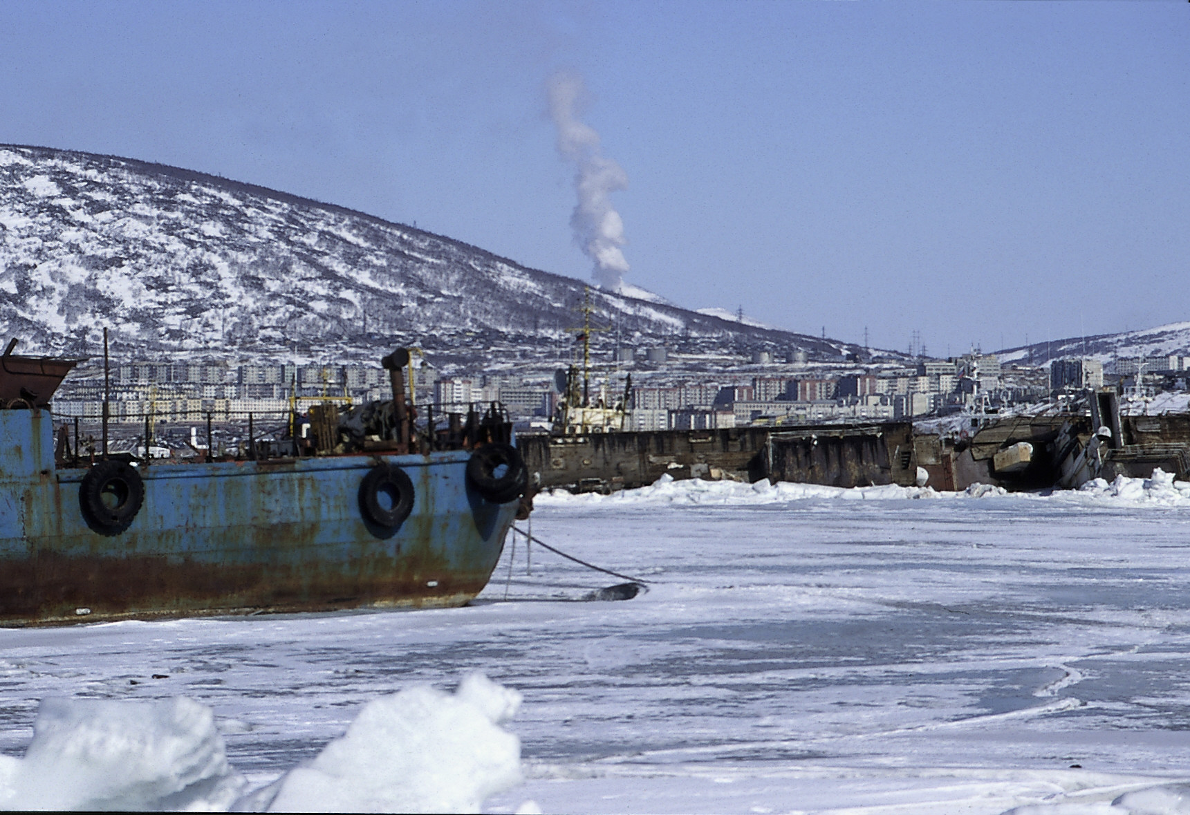 Der zugefrorene Hafen von Magadan, ehemals verbotene Stadt (Gulag) in Sibirien, heute die sogenannte "Goldmetropole" Russlands. Foto: ZDF und Cornelia Laqua