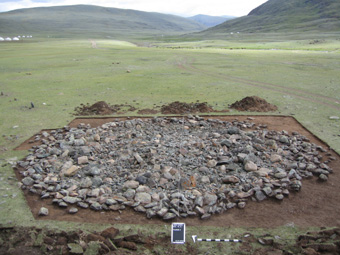 Ein Kurgan. Unter dem Steinkreis ist eine Grube eingetieft, darin befindet sich eine hölzerne Grabkammer und dort liegt die Mumie. So der Idealfall. Grabräuber und die globale Klimaerwärmung machen den Archäologen die Arbeit überaus schwer. Unter welchem Steinkreis steckt noch eine intakte und unberaubte Leiche im Eis? Foto: ZDF / Steffen Böttrich