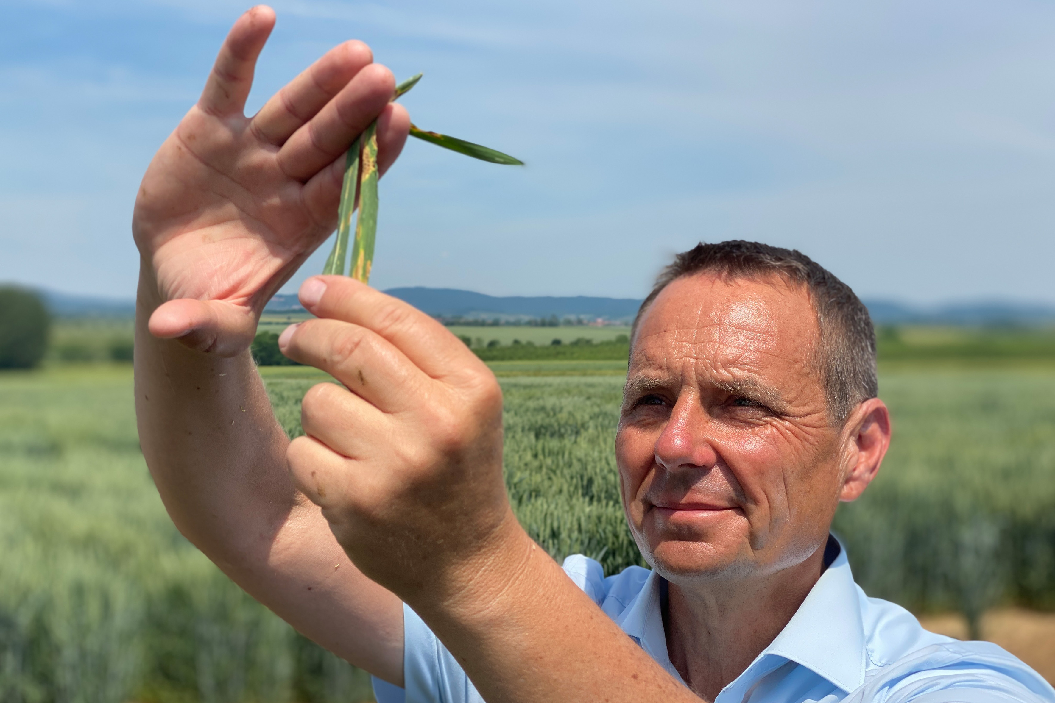 Pflanzenzüchter Stephan Streng mit von Gelbrost-Pilz befallenem Weizen. Bild: ZDF Fotograf: Christian Bock