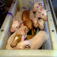 ARD/NDR - WARE TIER - "Auf der Suche nach munteren Kühen und Schweinen" ein Film von Christian Rohde am Donnerstag (26.10.06) um 23.45 Uhr vom NDR im Ersten. Ferkel beim Abtransport in den Maststall - Hoden kastriert, Eckzähne abgekniffen. Bild: NDR