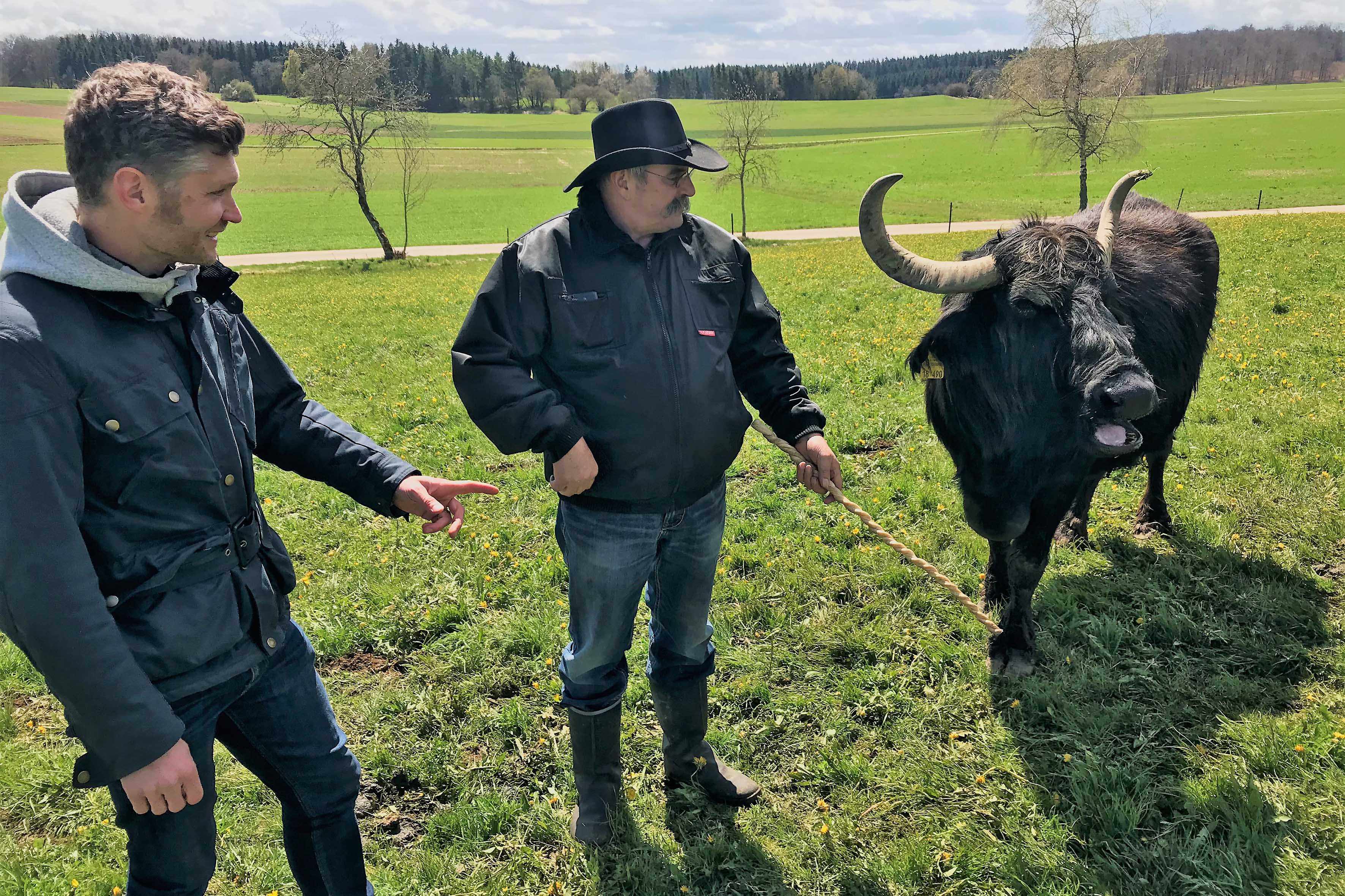 Thomas Lamparter (l.) will ein Leder aus Biohäuten herstellen. Er besucht den Bauer Willi Wolf (r.) auf dessen Weide in Hohenstein. Bild: ZDF Fotograf: Felix Franz
