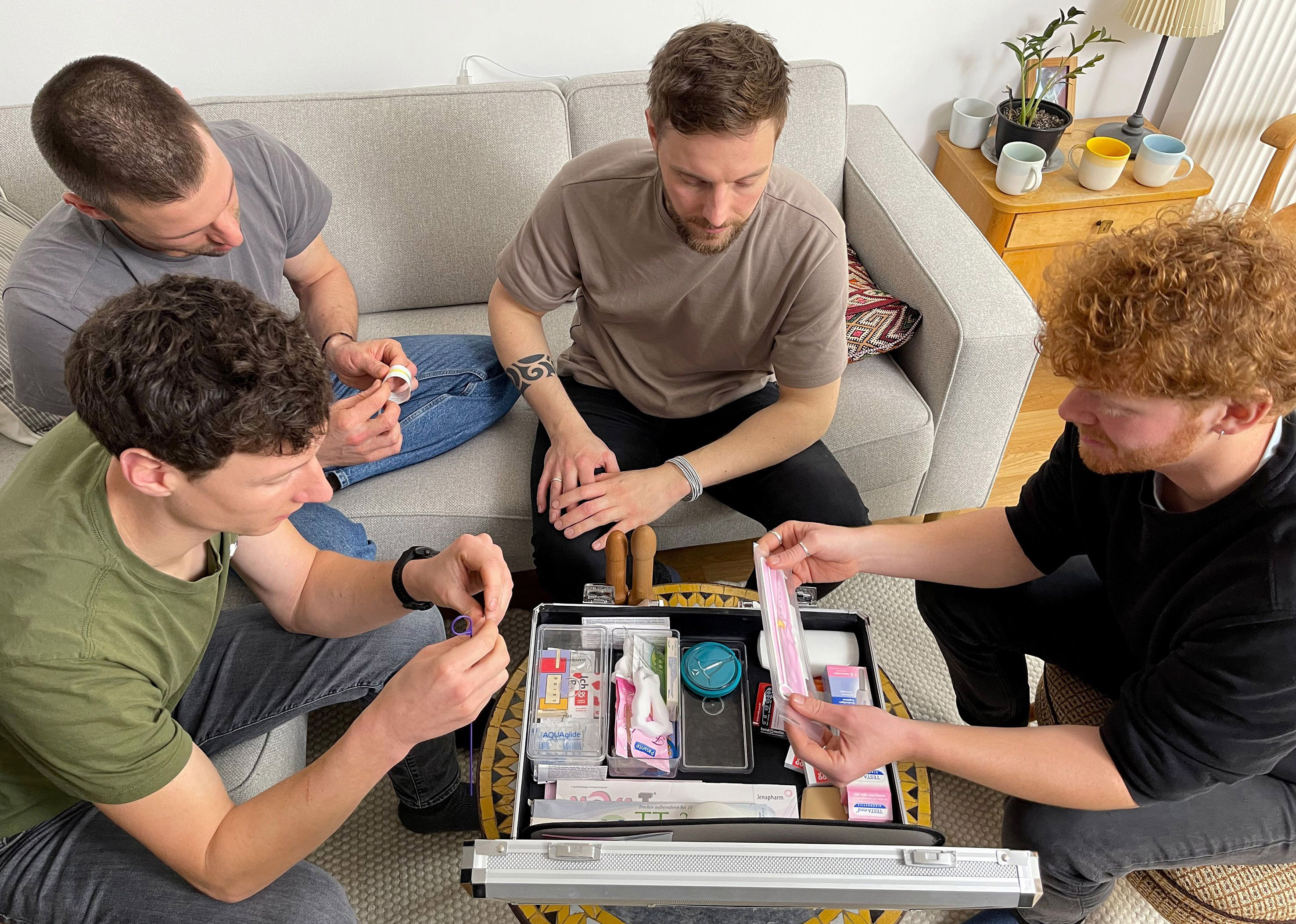 Reporter Florian Lohoff (2. v. r.) und seine Freunde entdecken den Inhalt eines Verhütungskoffers.