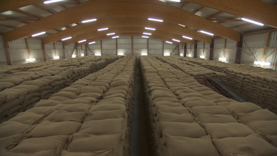 Standort geheim: Keiner darf wissen, wo die Lager der zivilen Notfallreserven sind. In dieser Halle werden Reis, Erbsen und Linsen gelagert. Bild: ZDF und Felix Greif