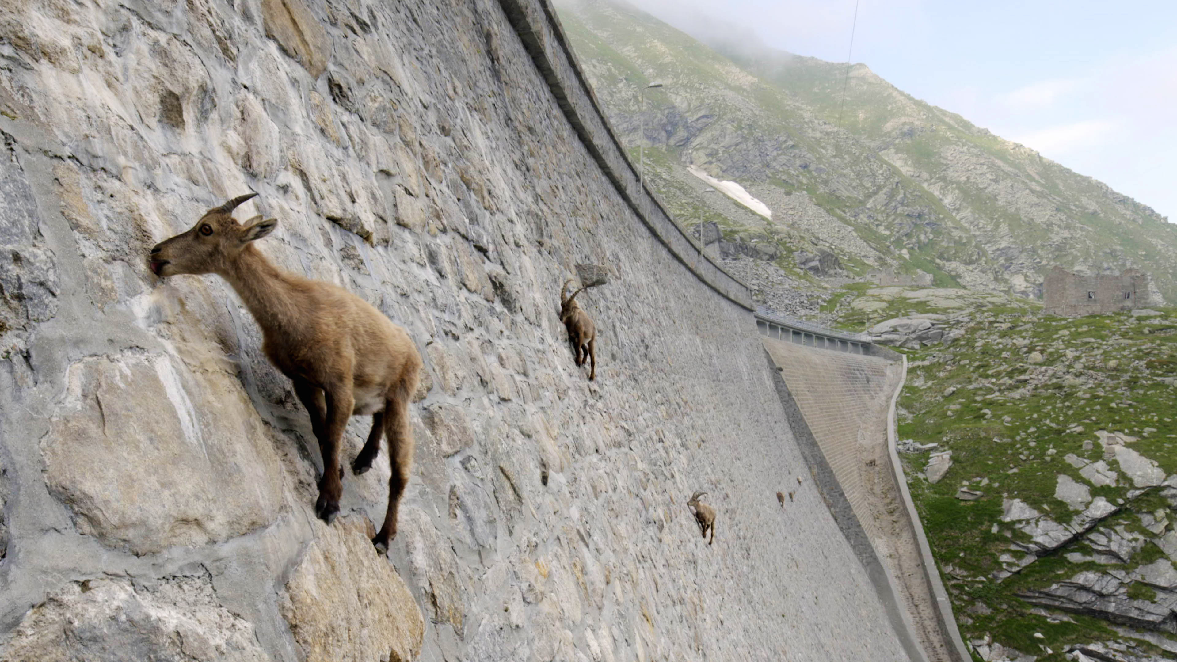 Klettertour auf der Suche nach Mineralien: Alpensteinböcke bezwingen den 50 Meter hohen Cingino-Damm in Norditalien. Bild: "obs/ZDF/Alex Ranken"