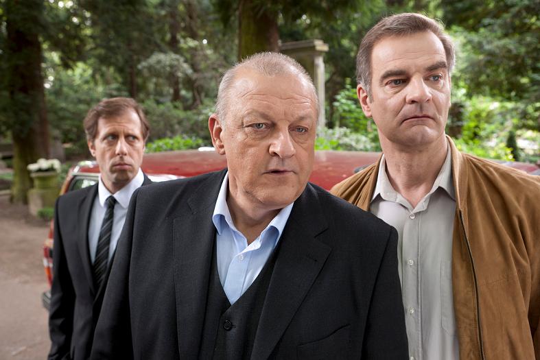Manni (Heinrich Schafmeister, re.), Wilsberg (Leonard Lansink, Mi.) und Ekki (Oliver Korittke) beschatten einen Verdächtigen während einer Beerdigung. Bild: ZDF und Thomas Kost