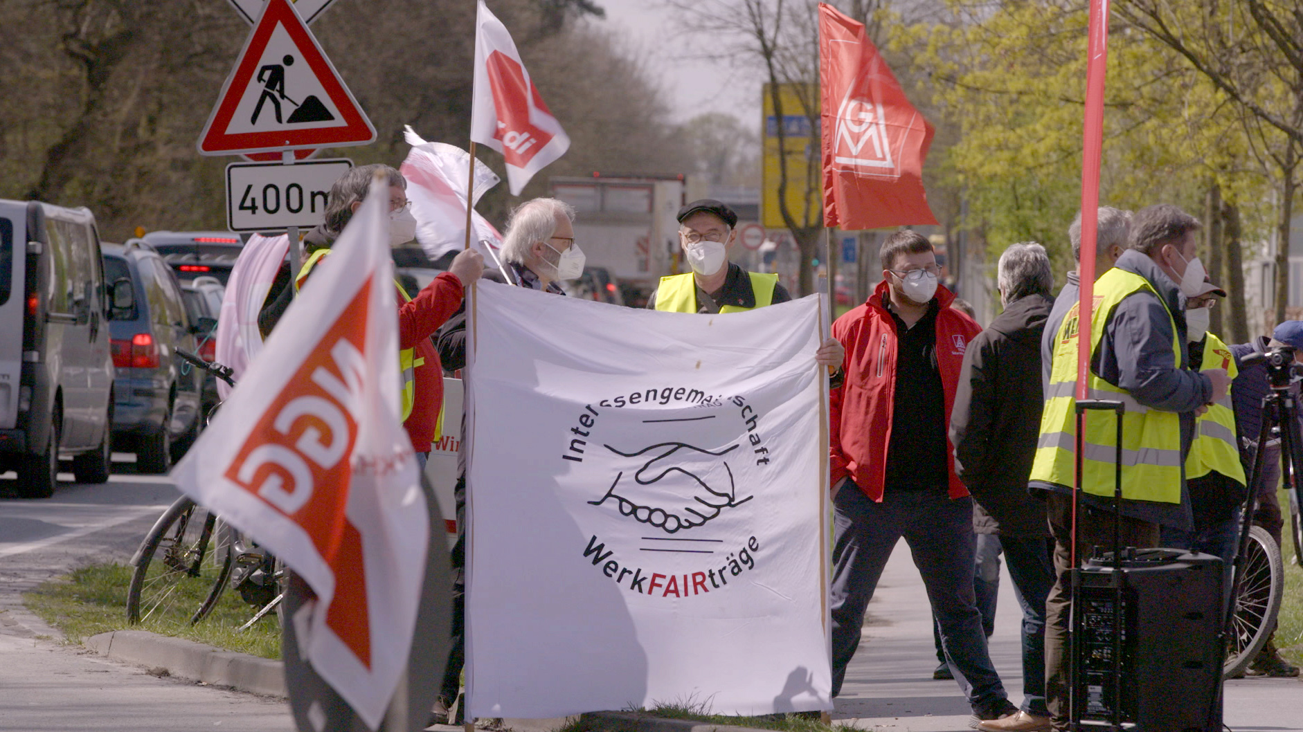 Auf einer Demonstration vor den Tönnies-Werken am 23. April 2021 forderten Gewerkschaften und Mitarbeitende bessere Löhne. Bild: ZDF Fotograf: Ralf Huppke