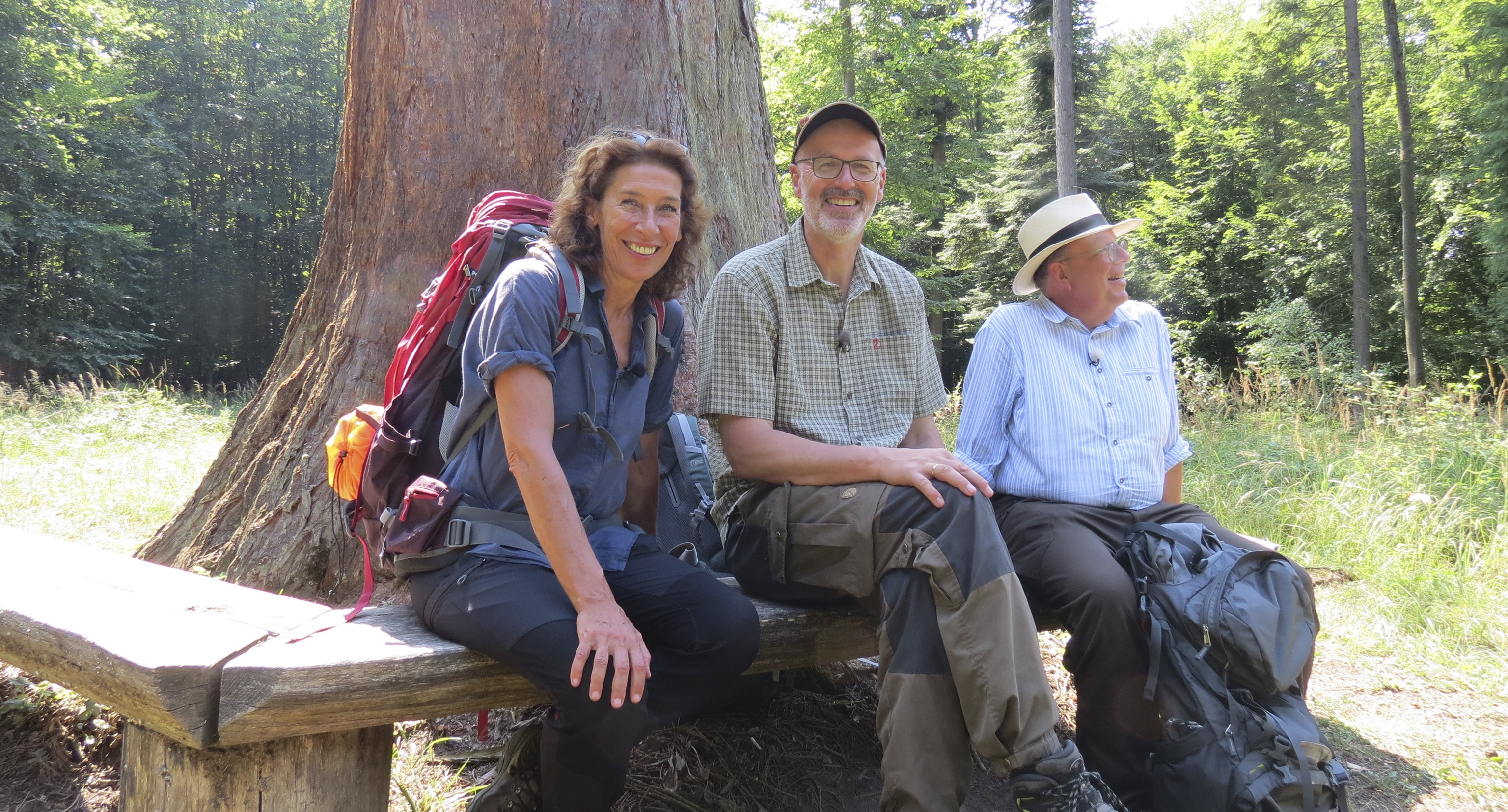 Das Ziel ist ein Baum mit Migrationshintergrund: V.li. Adele Neuhauser, Peter Wohlleben und Denis Scheck vor einem beeindruckenden Mammutbaum im Naturpark Schönbuch. Bild: "obs/SWR - Südwestrundfunk/Encanto"