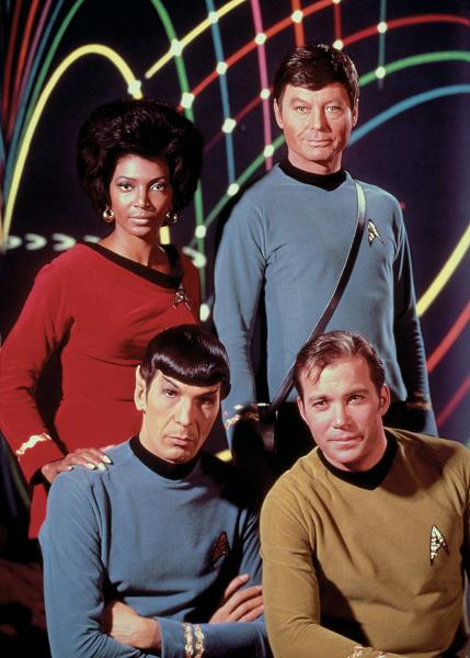 Lieutenant Uhura (Nichelle Nichols, l.), Mr. Spock (Leonard Nimoy, 2.v.l.), Schiffsarzt Dr. McCoy (DeForest Kelley, 2.v.r.) und Captain Kirk (William Shatner, r.) sorgen für Recht und Ordnung an Bord der Enterprise. Bild: ZDF und TM & © 2010 CBS Studios Inc. All Rights Reserved.
