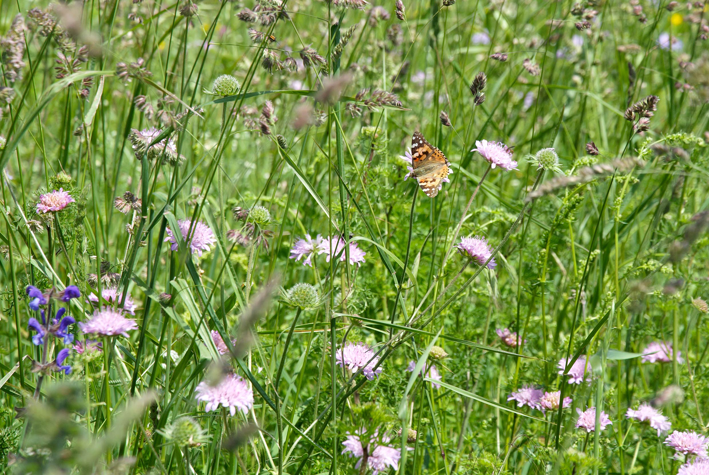 Der Distelfalter liebt blütenreiche Lebensräume - die zartviolette Skabiose kommt ihm gerade recht.