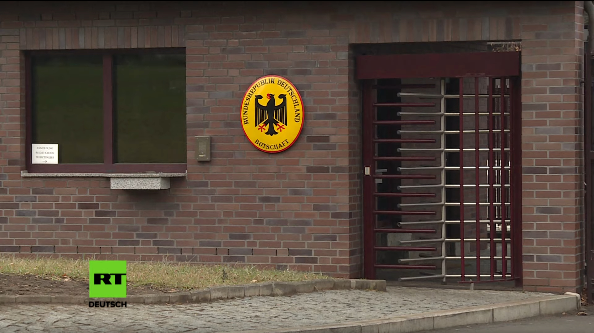 Bild: Screenshot Youtube Video: "Deutsche Botschaft in Moskau: Kein Kommentar zur Ausweisung deutscher Diplomaten" (https://www.youtube.com/watch?v=YxAxAUIykIg) / Eigenes Werk