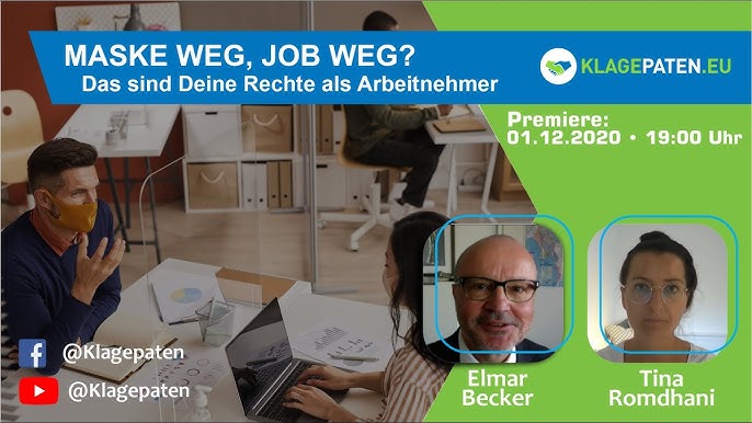 Bild: SS Video: "đź”´ Klagepaten TV #17 - Maske weg, Job weg? Rechte als Arbeitnehmer - mit Tina Romdhani & Elmar Becker" (https://youtu.be/2eNfx6tXA4M) / Eigenes Werk