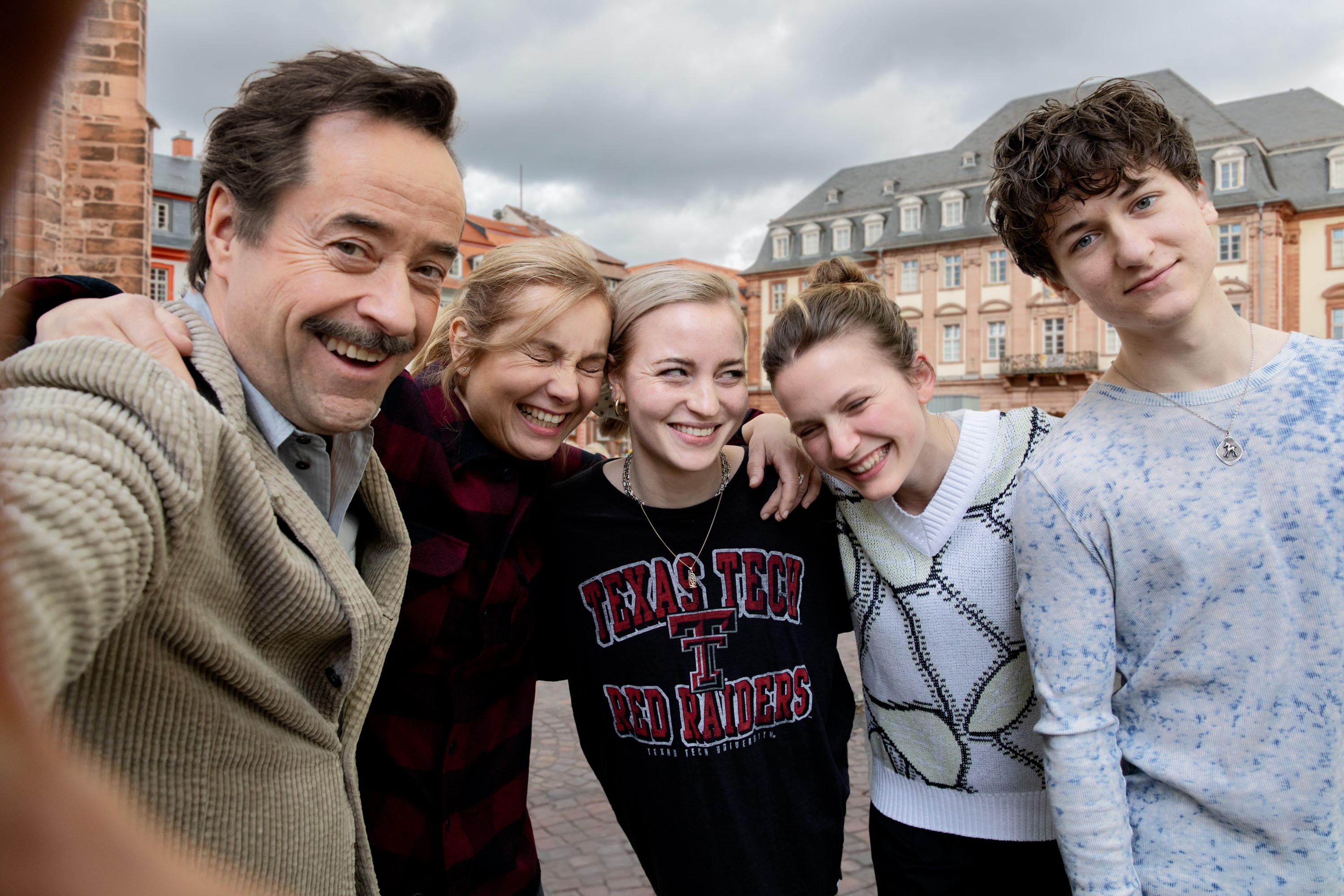 Heinz Hellmich (Jan Josef Liefers), Carla Hellmich (Nadja Uhl), Mavie Hellmich (Sarah Mahita), Leni Hellmich (Momo Beier) und Linus Hellmich (Juri Sam Winkler). Bild: LEONINE Studios/Wiedemann & Berg Fotograf: Jürgen Olczyk