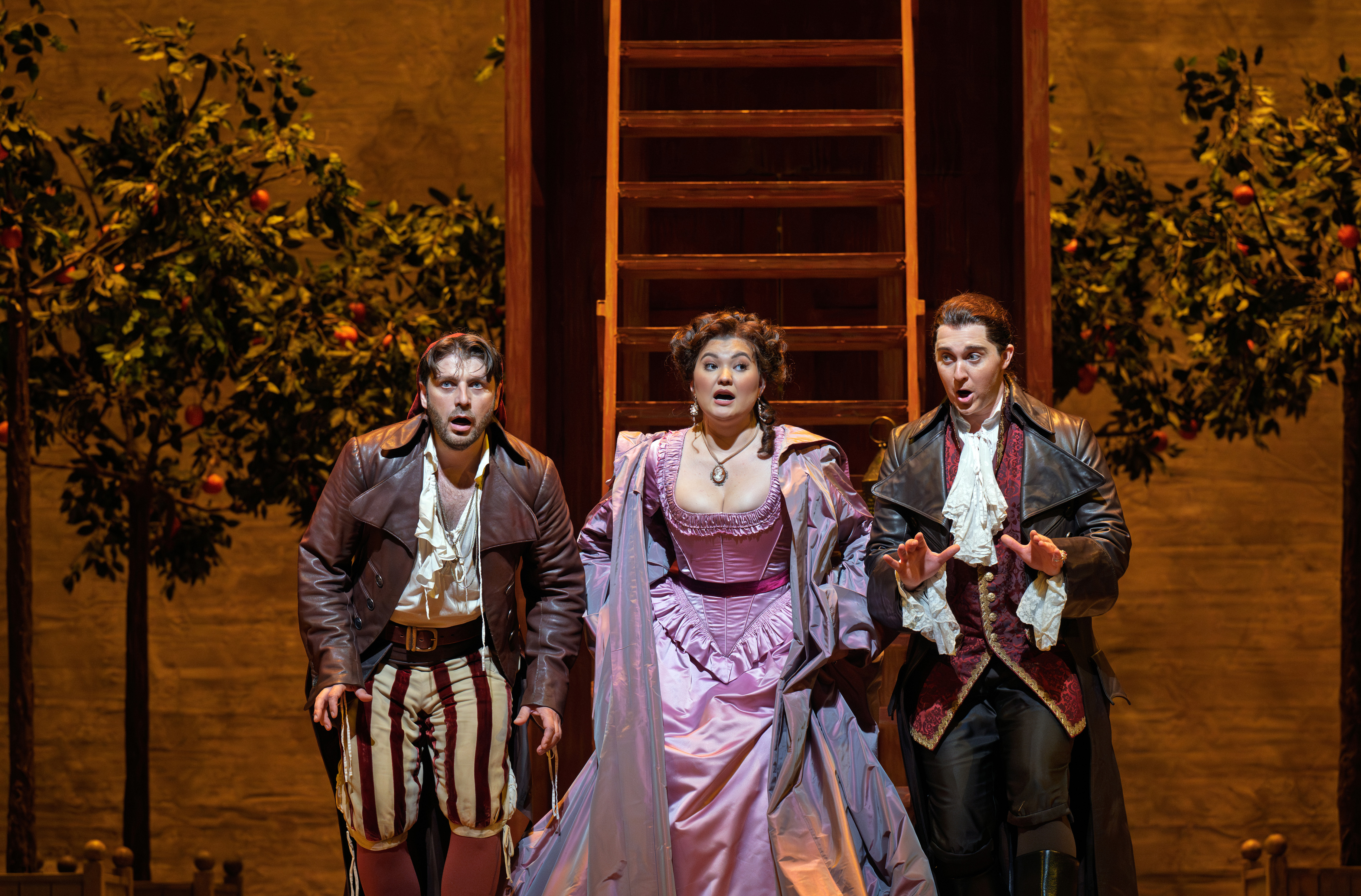 Andrey Zhilikhovsky als Figaro, Aigul Akhmetshina als Rosina und Jack Swanson als Count Almaviva in Rossinis IL BARBIERE DI SIVIGLIA Bild: LEONINE Studios Fotograf: Jonathan / Met Opera