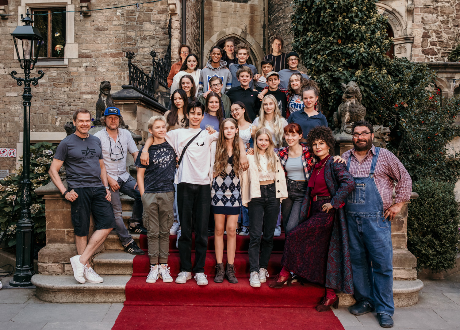 v.l.n.r. am Set auf Schloss Wernigerode: 1. Reihe: Regisseur Sven Unterwaldt, Kameramann Bernhard Jasper, Darsteller Leonard Conrads, Loris Sichrovsky, Lilith Johna, Emilia Pieske, Emilia Maier, Nadja Uhl, Heiko Pinkowski. 2. Reihe: Darsteller Charlotte Hagenbucher, Phillis Lara Lau, Purnima Grätz, Ivy Josefine Ullrich, Emmylou Nensel. 3. Reihe: Darsteller Luzie Nadjafi, Thilo Fridolin Matthes, Tristan Schreck, Lauri Kröck, Margo Skiba. 4. Reihe: Darsteller Deniz Akyüz, Noel Diop, Juri Becker, Emil Mascheck, Jakob Weingärtner. 5. Reihe: Autorin Margit Auer, Produzentin Meike Kordes. Bild: LEONINE Studios Fotograf: LEONINE Studios
