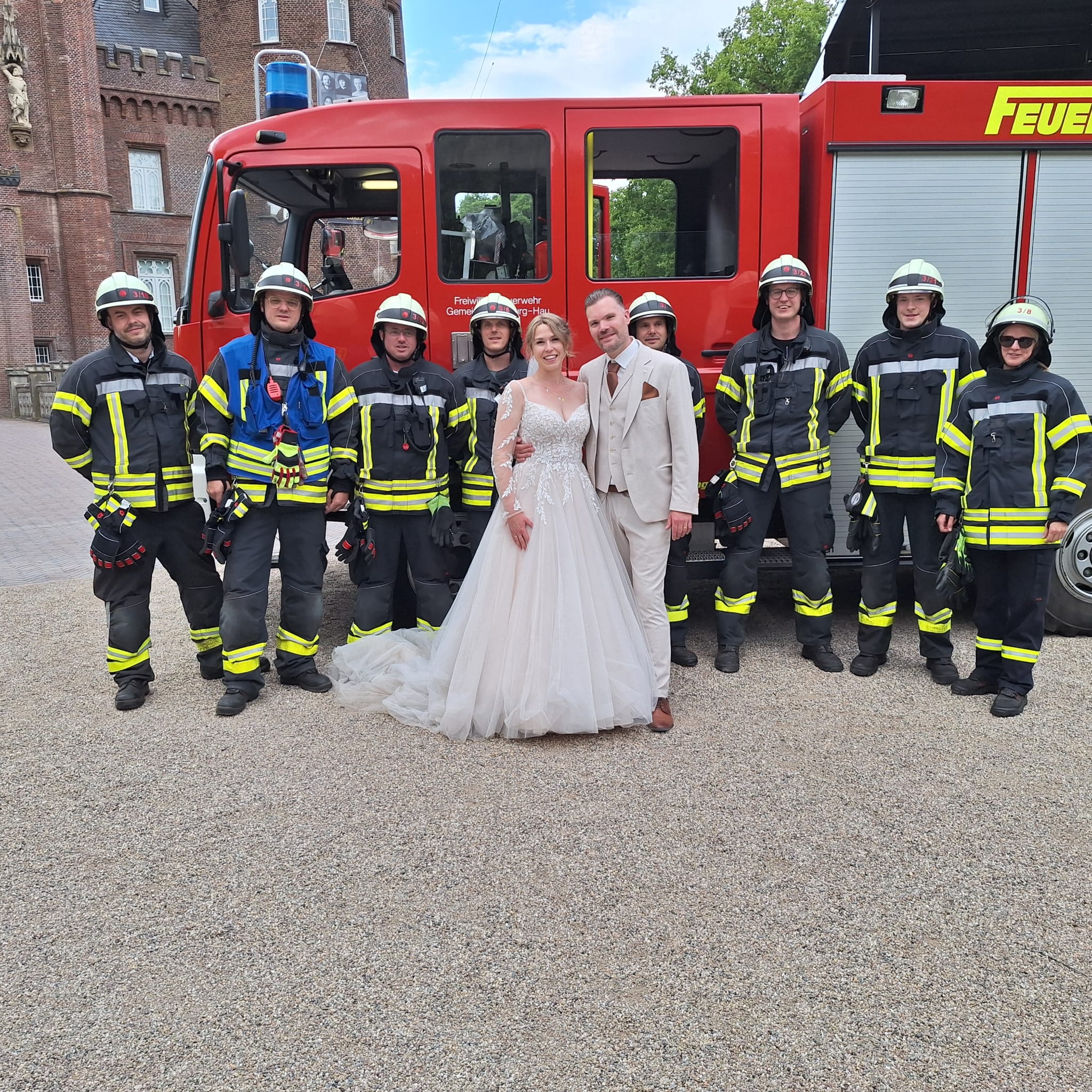 Das Brautpaar nutzte die Gelegenheit für ein ganz besonderes Erinnerungsfoto mit den Einsatzkräften Bild: Feuerwehr