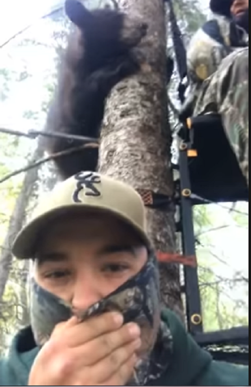 Männer schauen fassungslos zu wie Bär Jägerstand „stürmt“