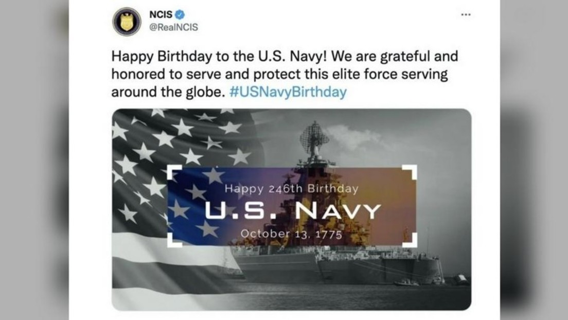 Eine vom US-amerikanischen Navykriminaldienst (NCIS) veröffentlichte Grafik vom 13. Oktober 2021, in der ein Foto eines russischen Kriegsschiffs verwendet wird, um der US-Navy zum Jahrestag zu gratulieren.