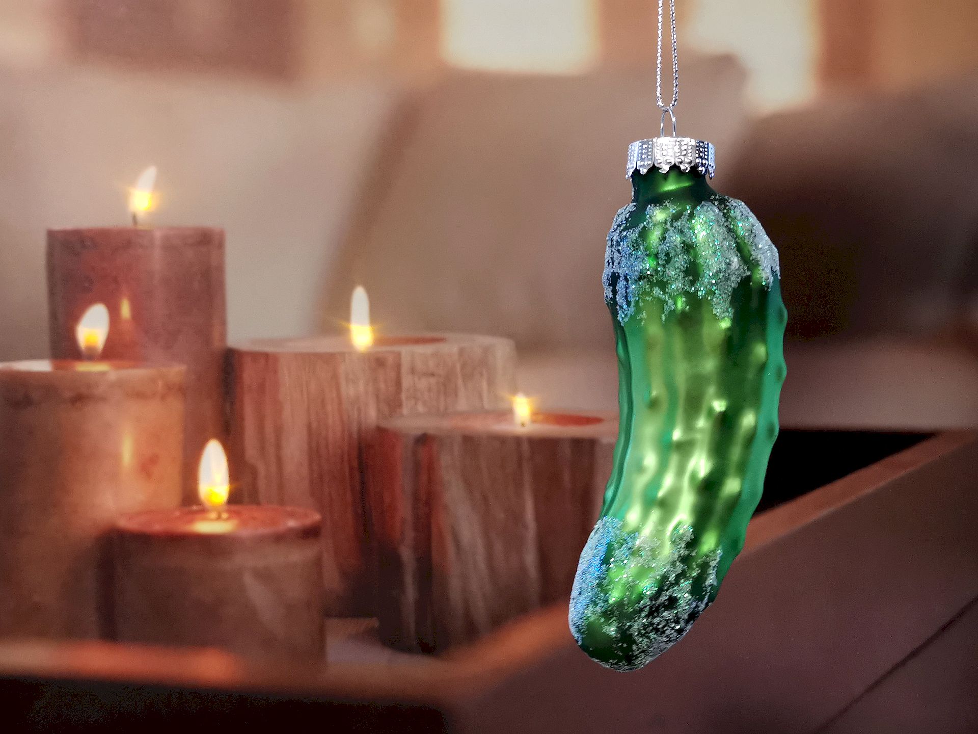 Gurken als Weihnachtsbaumschmuck gibt es in verschiedenen Ausführungen - inzwischen auch bei uns.