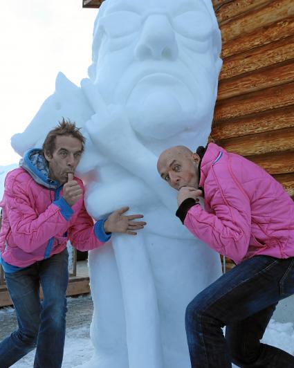Die Künstler Oropax neben Peer Steinbrück als Schneemann des Jahres. Bild: "obs/AROSA TOURISMUS/swiss-image/Nadja Simmen"