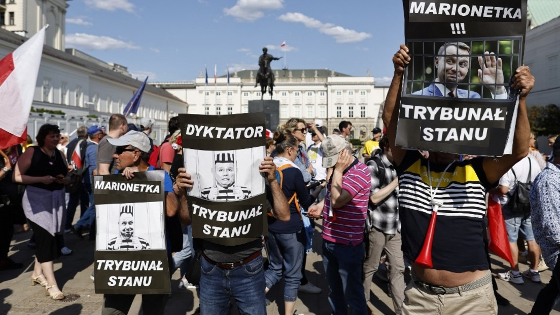 Duda und Morawiecki – alles Marionetten des Kreml, zumindest in Augen dieser Demonstranten in Warschau (04.05.23)