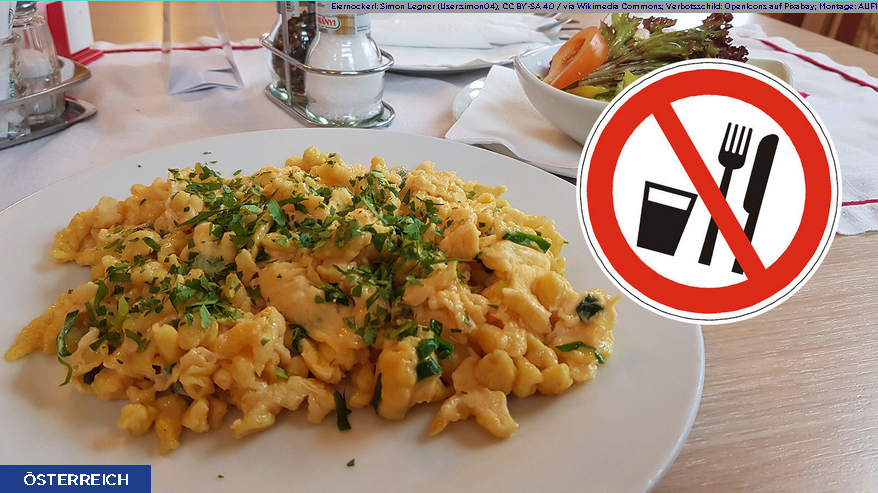 Bild: Eiernockerl: Simon Legner (User:simon04), CC BY-SA 4.0 / via Wikimedia Commons; Verbotsschild: OpenIcons auf Pixabay; Montage: AUF1 / Eigenes Werk