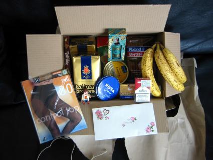 Care Paket mit Kaffee, Bananen, Kölnisch Wasser, Damenstrumpfhosen, Mehl und anderen guten Dingen aus dem Westen