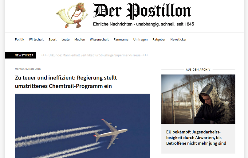 Zurück zu Der Postillon: "Regierung stellt umstrittenes Chemtrail-Programm ein"
