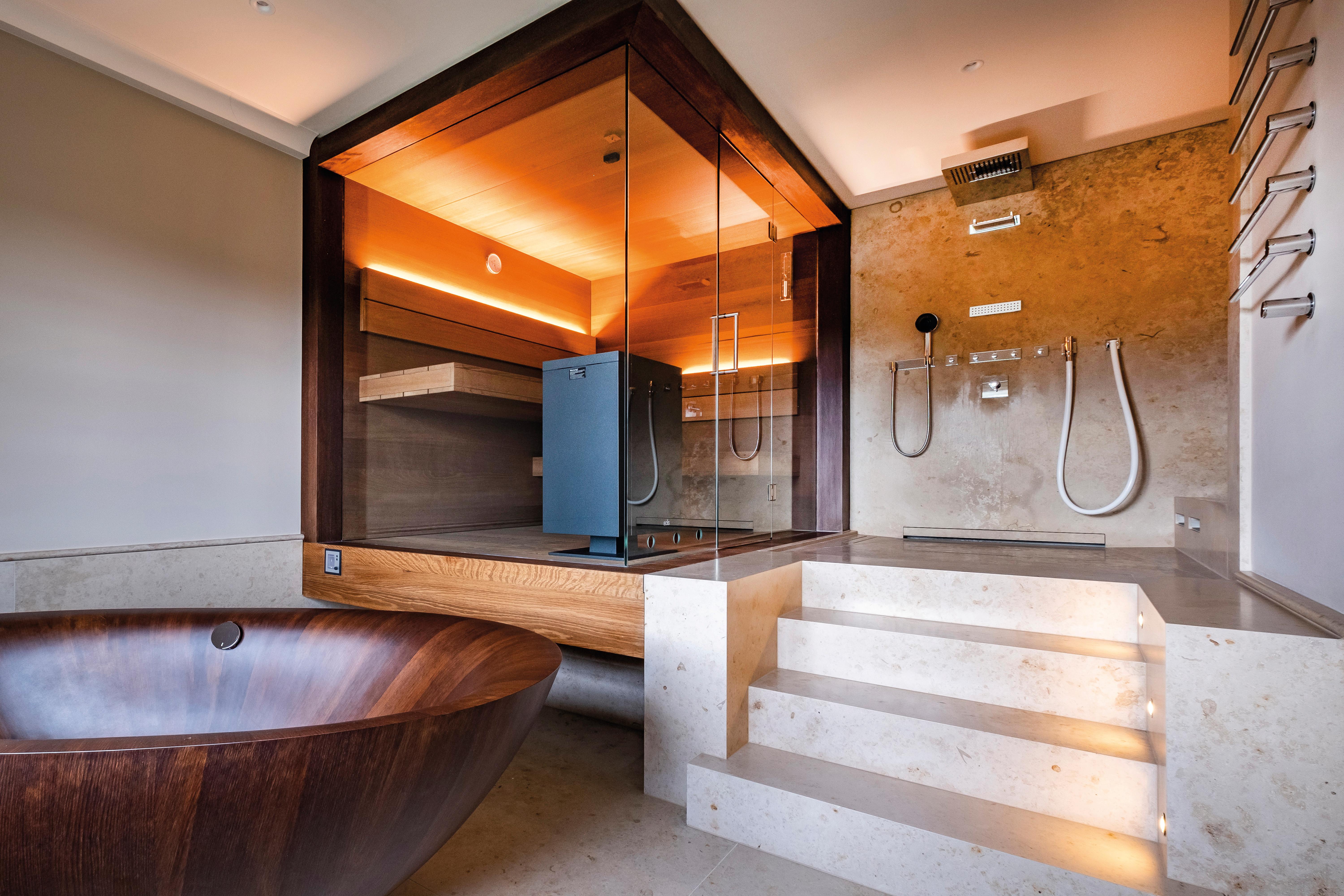 Design Sauna im Bad in Eiche mit frei schwebenden Saunabänken Bild: corso sauna manufaktur Fotograf: Arnt Haug
