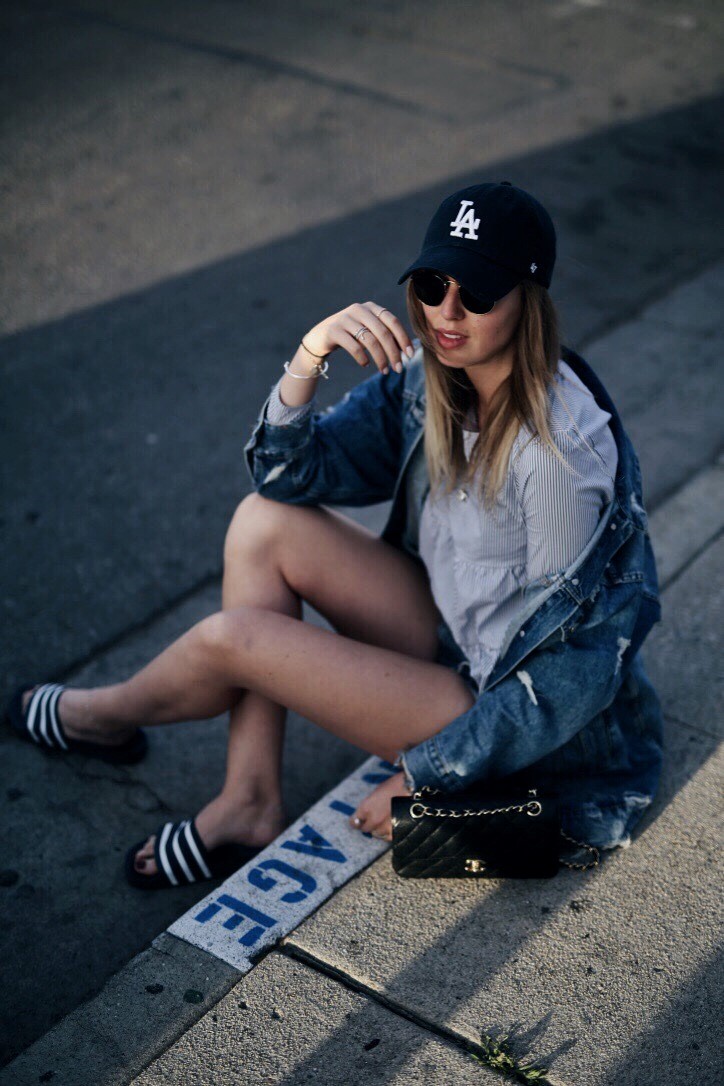 Bloggerin Kira von Shoppisticated zeigt, wie der neue Adiletten-Trend stylish kombiniert wird. Bild: "obs/StyleLounge GmbH/Instagram/Shoppisticated"