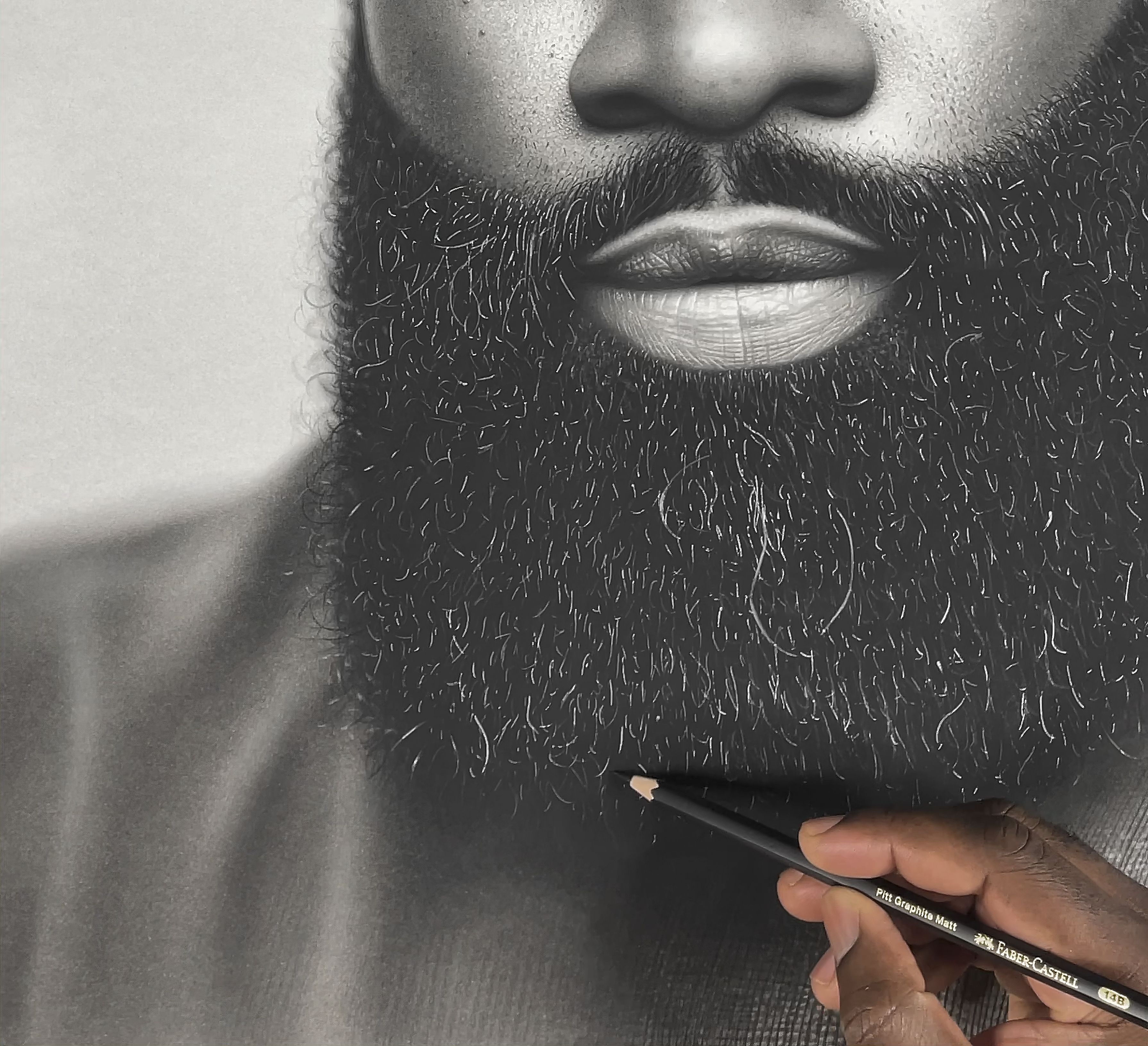 Fotorealistisches Selbstportrait des britischen Künstlers Kelvin Okafor, gezeichnet mit dem neuen Pitt Graphite Matt Bleistift von Faber-Castell. Bild: Faber-Castell Fotograf: Faber-Castell
