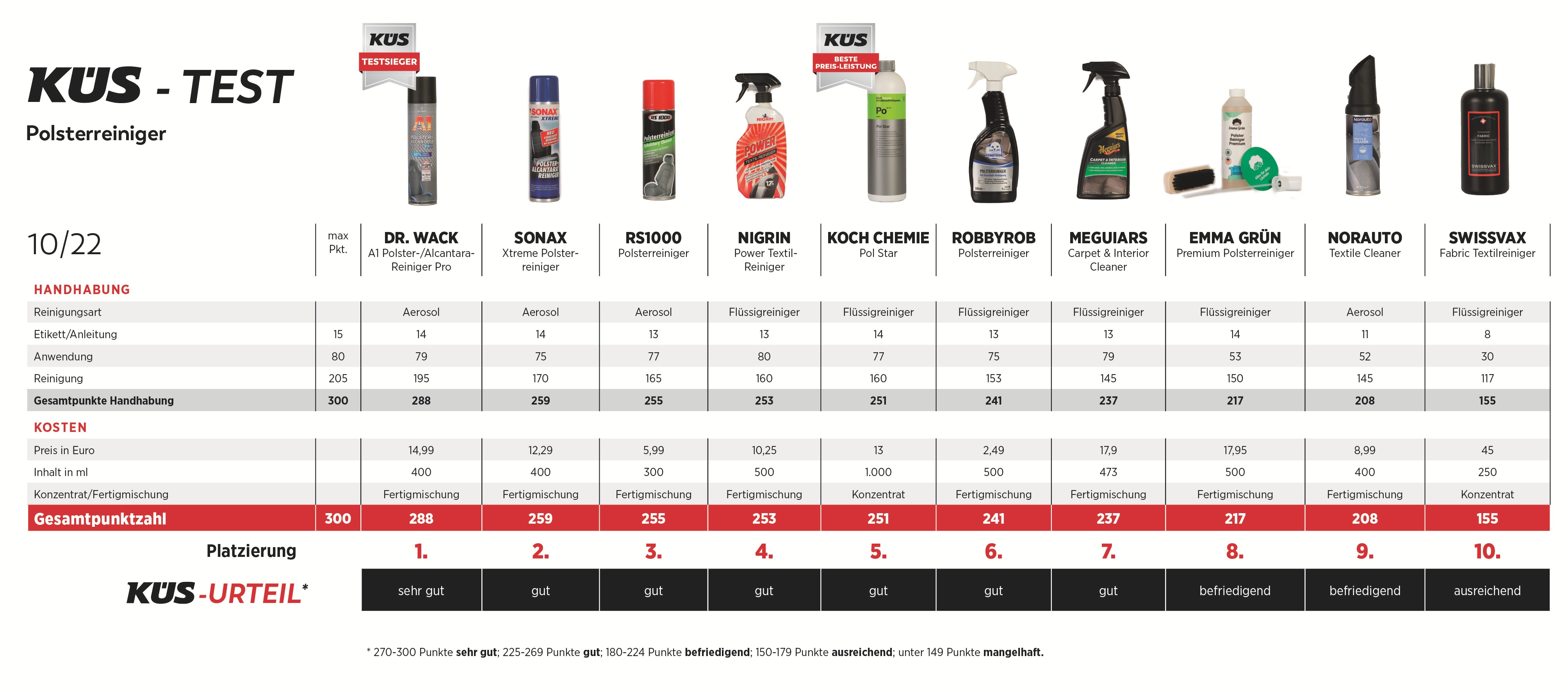 Zurück zu Polsterreiniger fürs Auto im KÜS-Test: Teuer ist nicht gleich gut Zehn Reiniger im Praxisvergleich - nur einer versagt