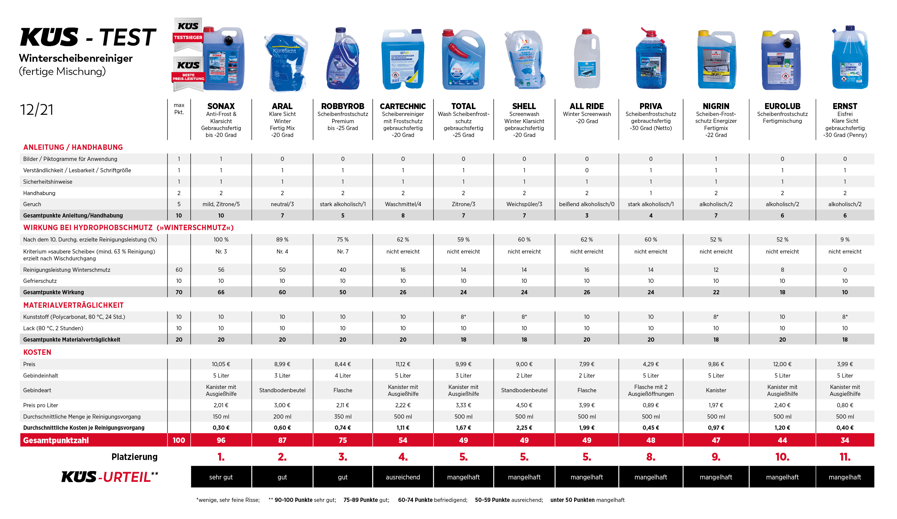 Die Ergebnisse des KÜS-Tests "Winterscheibenreiniger" im Überblick. Bild: KÜS Fotograf: KÜS