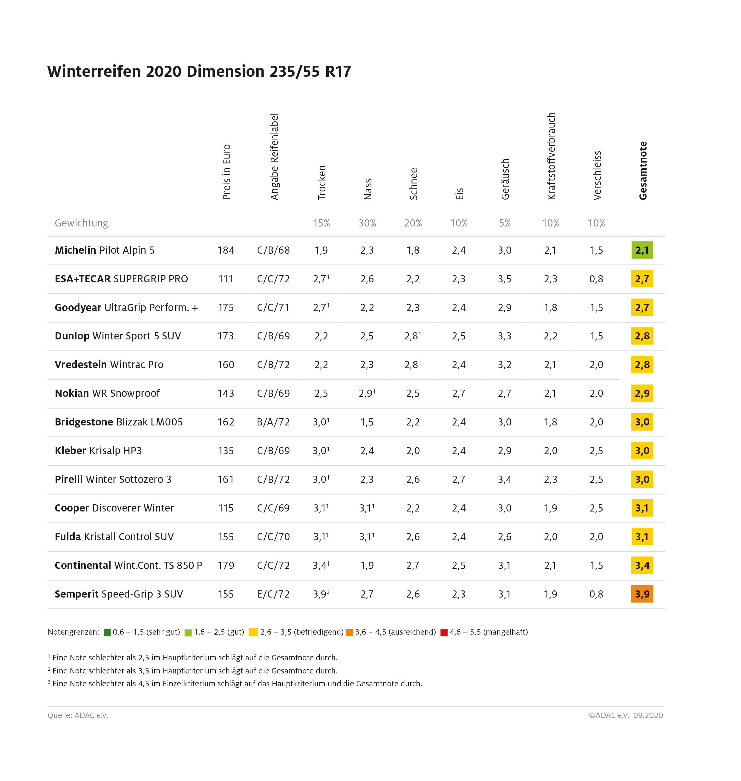 Zurück zu Winterreifen: Ausgewogen und empfehlenswert Reifen für untere Mittelklasse, SUV und Vans im ADAC Test