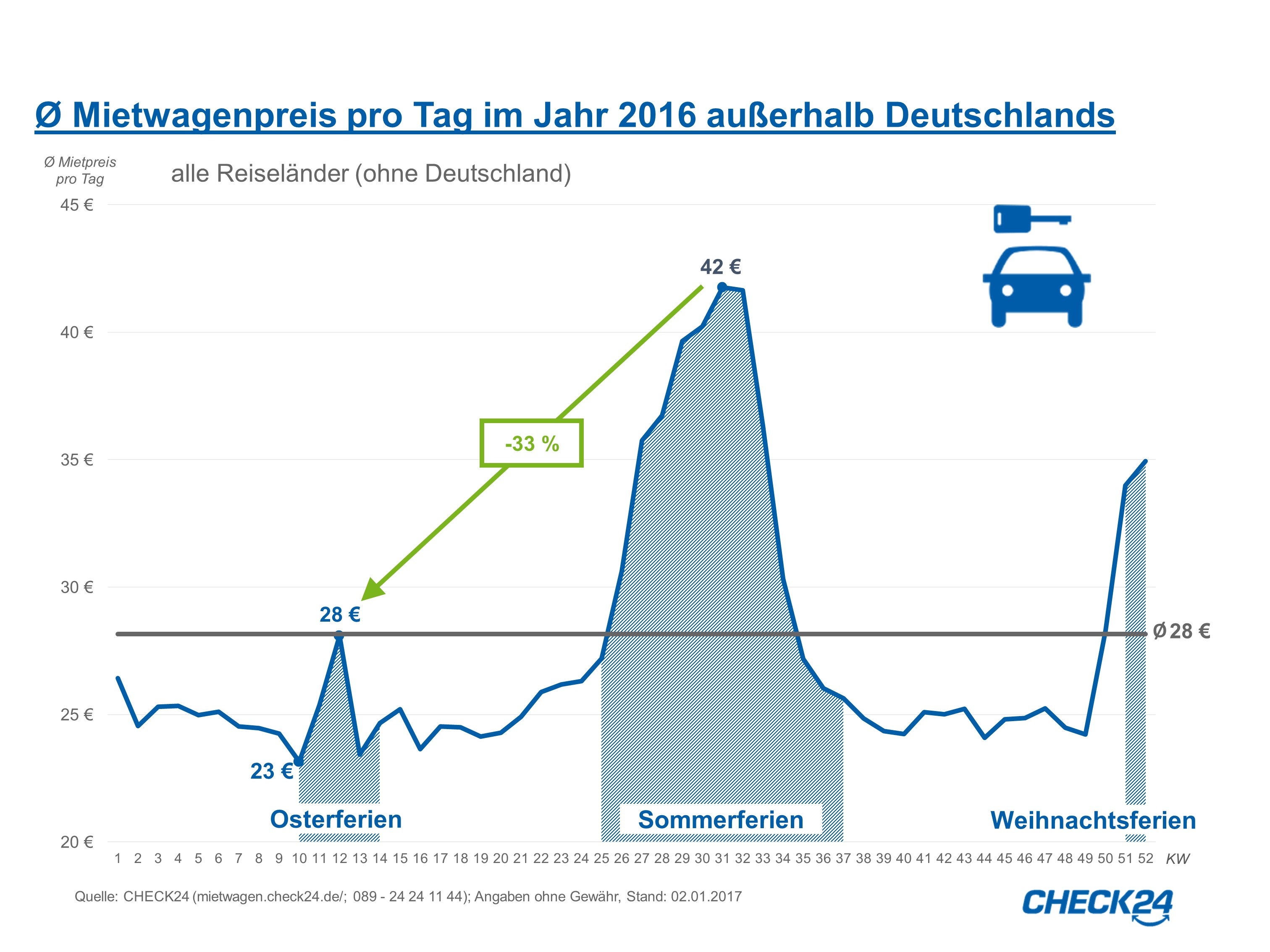 Ø Mietwagenpreis pro Tag im Jahr 2016 außerhalb Deutschlands. Bild: "obs/CHECK24 Vergleichsportal GmbH/CHECK24.de"