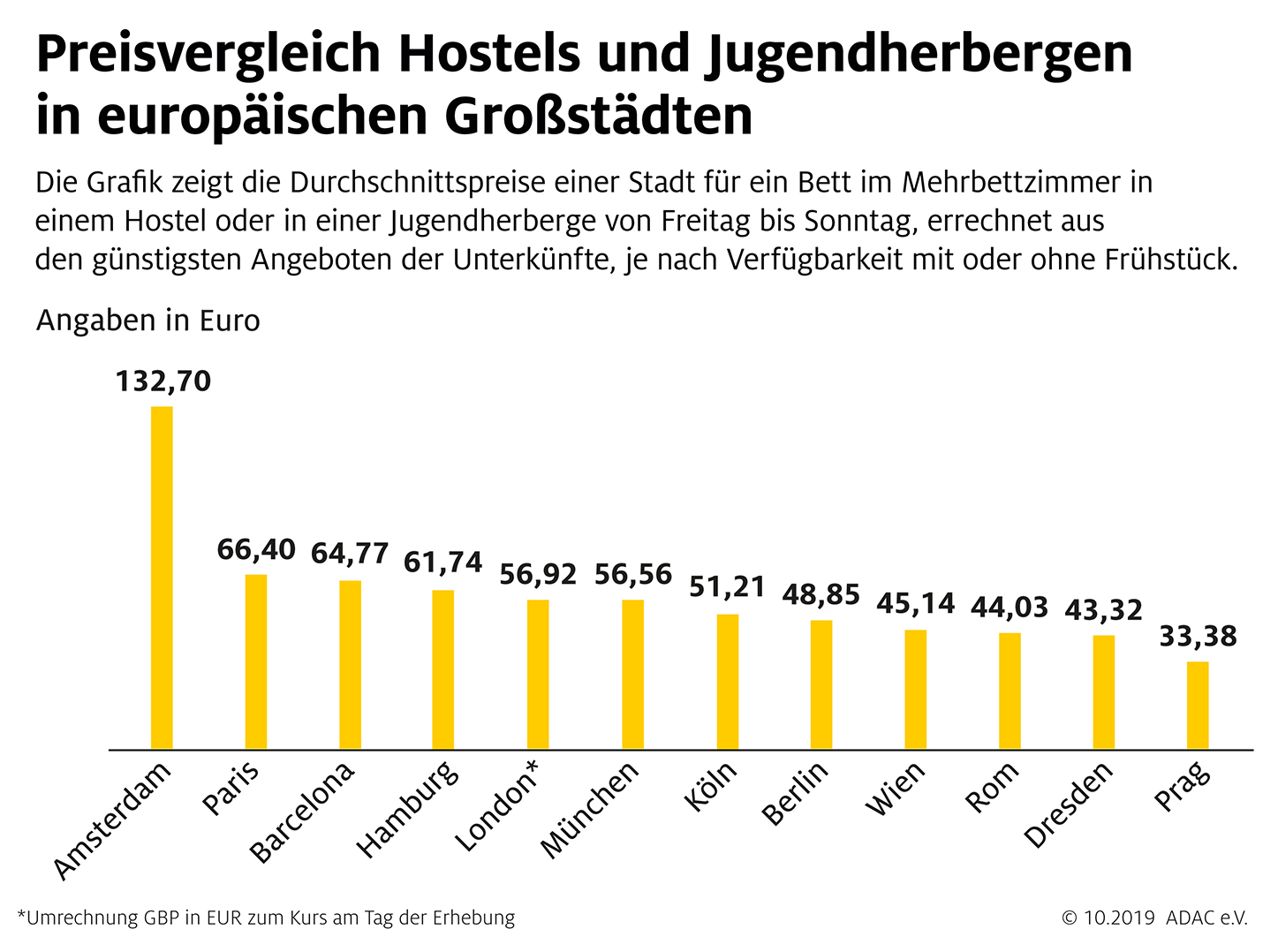 Grafik: Preisvergleich Hostels und Jugendherbergen in europäischen Großstädten / Hostels und Jugendherbergen im ADAC Preisvergleich / Bild: "obs/ADAC"