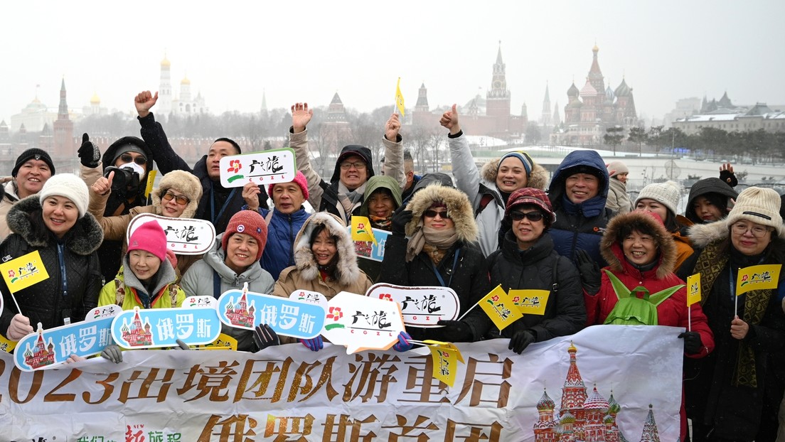 Eine chinesische Touristengruppe besichtigt den Sarjadje-Park in der russischen Hauptstadt Moskau, 24. Februar 2023. Bild: Sputnik / RAMIL SITDIKOW