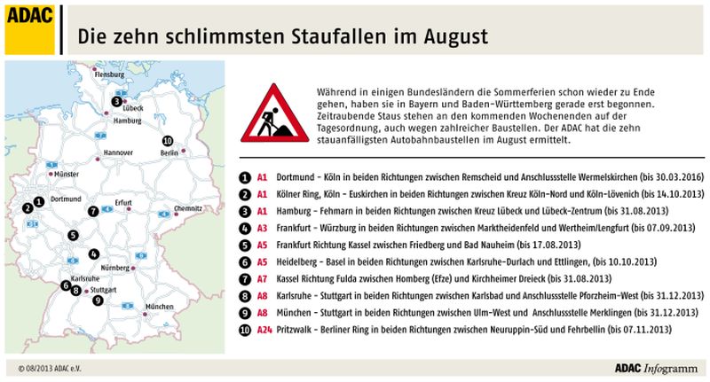 Die zehn stauanfälligsten Autobahnbaustellen im August. Bild: ADAC