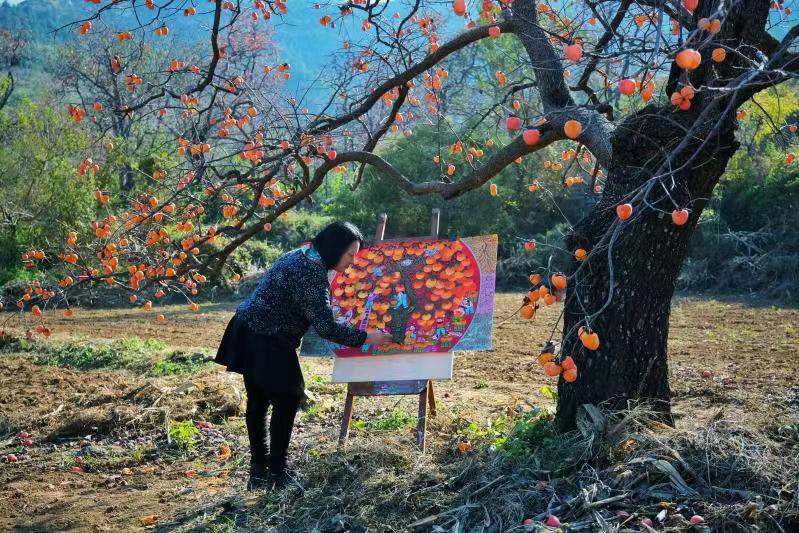Das Foto zeigt, dass ein lokaler Bauer in einem Kakigarten in der Stadt Qingzhou in der ostchinesischen Provinz Shandong malt. Bild: Xinhua Silk Road Information Service Fotograf: Xinhua Silk Road
