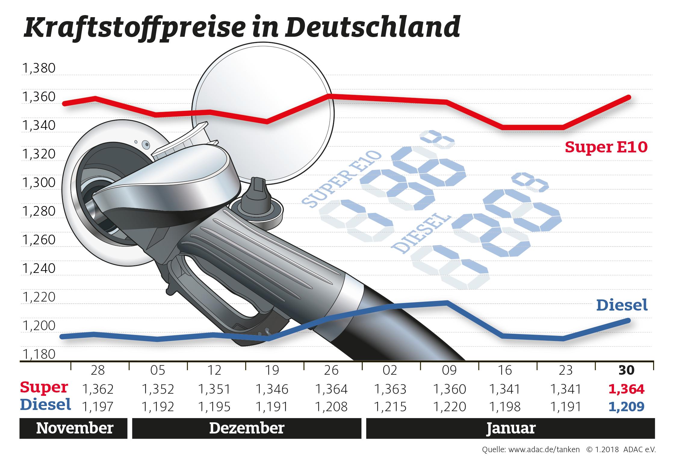 Kraftstoffpreise im Wochenvergleich. Bild: "obs/ADAC/ADAC-Grafik"