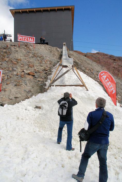 Der produzierte Schnee des IDE Snowmakers wird am Pitztaler Gletscher mittels einer Rutsche zur Piste gebracht und dort mit Pistengeräten verteilt. Die ÖSV-Mannschaft bestätigte: Die Schneequalität ist ausgezeichnet. Bild: pro.media/Pitztaler Gletscher