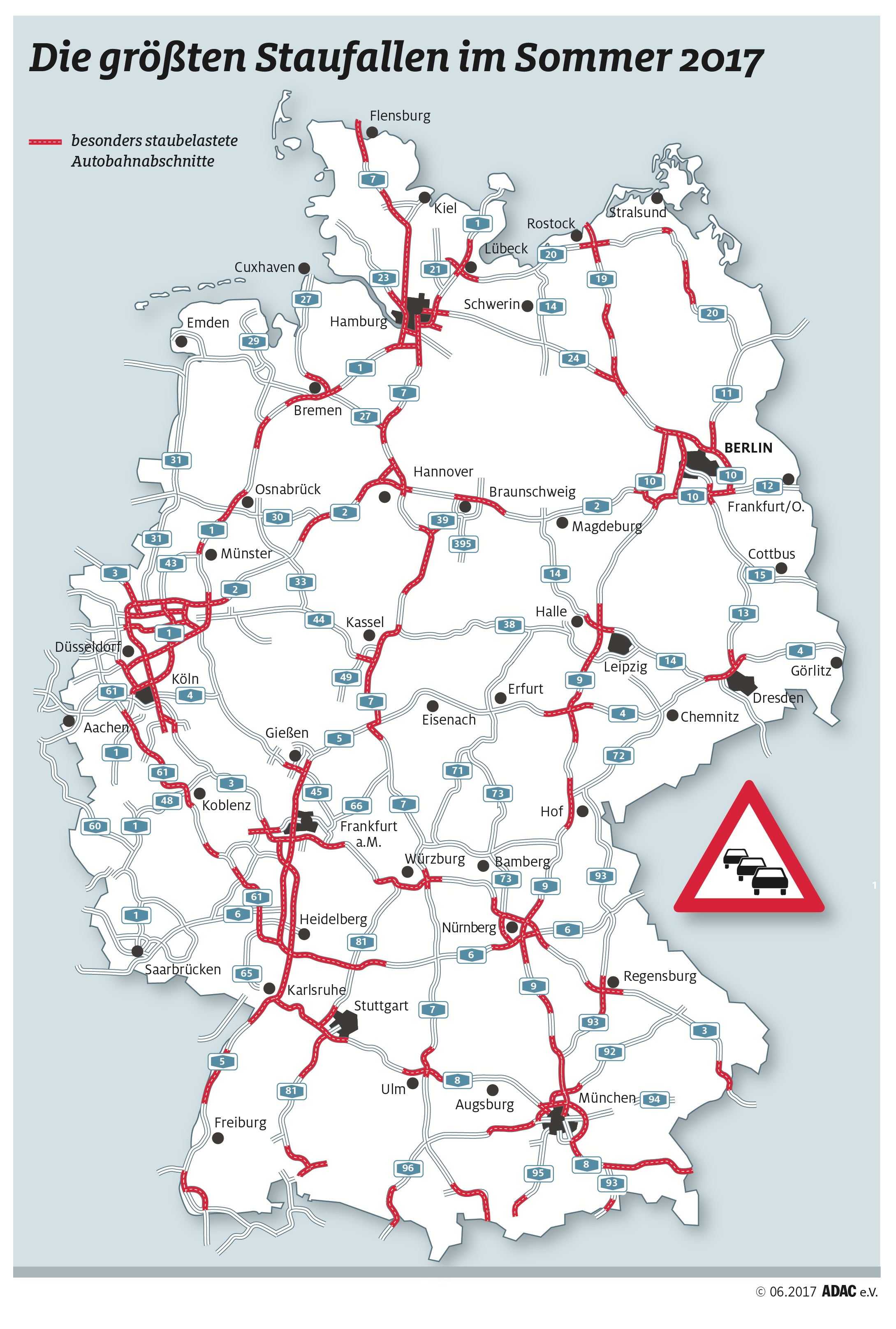 Urlauberkolonnen in alle Richtungen / In allen Bundesländern jetzt Ferien. Staustrecken im Sommer 2017. Bild: "obs/ADAC e.V."