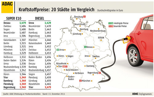 Kraftstoffpreise in 20 deutschen Städten: Bei Benzin fünf Cent