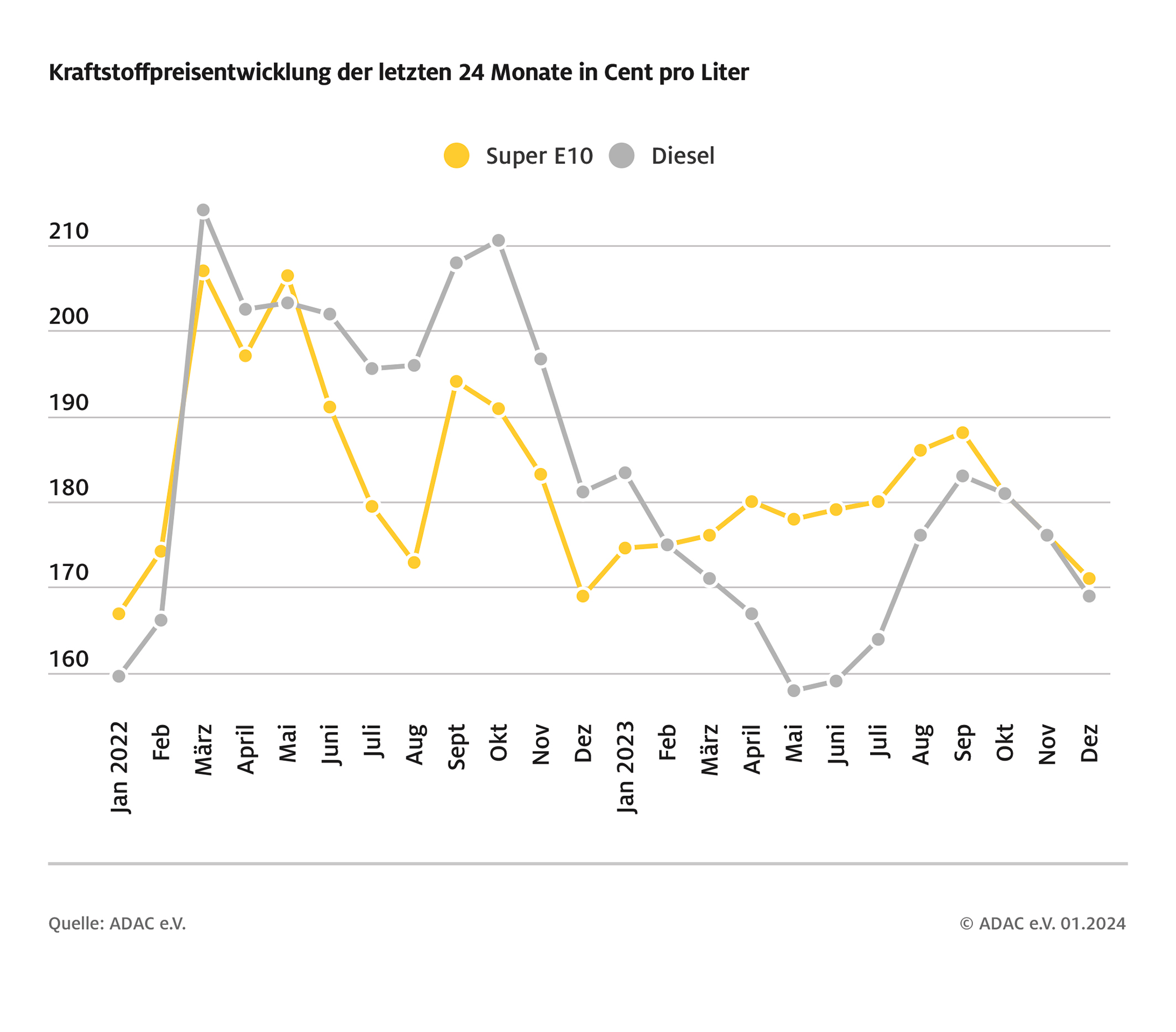 Entwicklung der Kraftstoffpreise in den letzten 24 Monaten Bild: ADAC Fotograf: ADAC