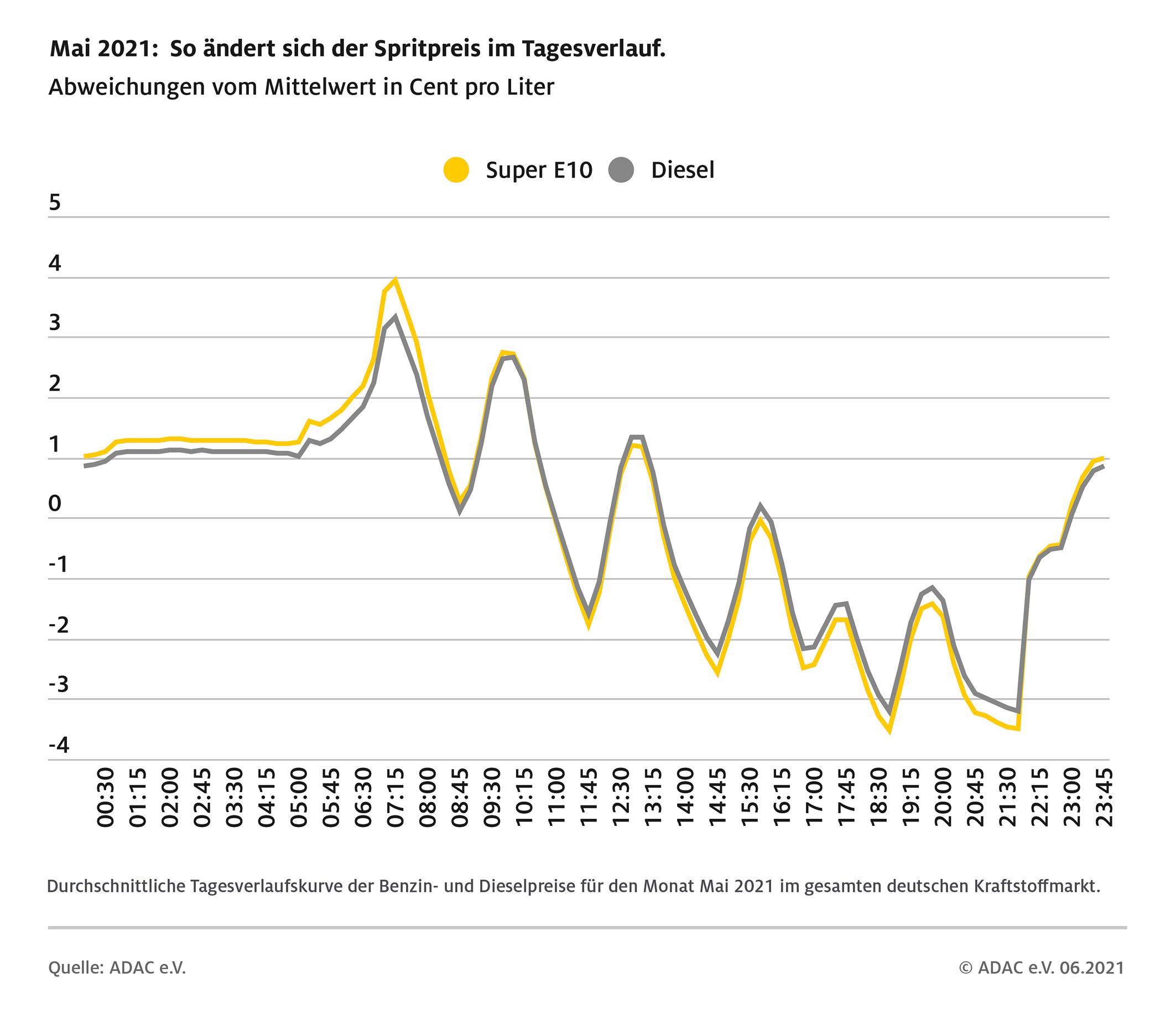 Kraftstoffpreise im Tagesverlauf, Mai 2021 Bild: ADAC Fotograf: © ADAC