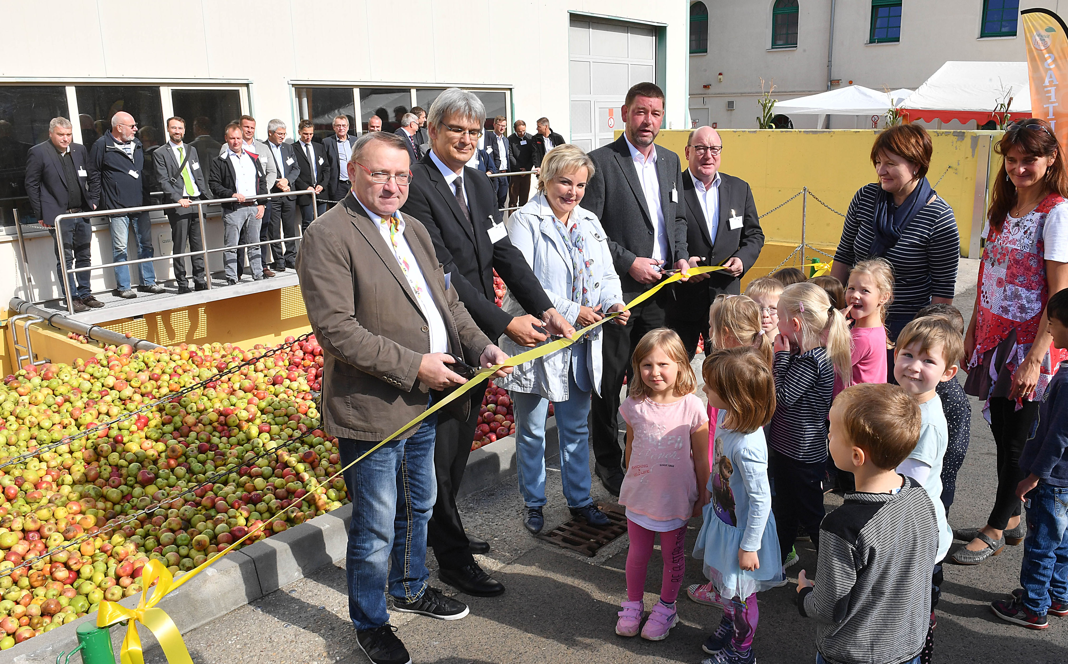 Besuch Deinen Saftladen! Im Bild: Eröffnung mit dem örtlichen Kindergarten Tausendfüßler, Andreas Mehlhorn, Jörg Müller von Berneck, Veronika Bellmann (MdB), Ronny Thiele, Klaus Heitlinger / Bild: "obs/VdF Verband der deutschen Fruchtsaft-Industrie/Wolfgang Schmidt"